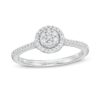 This classic style is crafted in 10K white gold, with a diamond composite that sparkles in a halo of diamonds. This ring is stunning with 1/4 carat diamonds and brilliant polish.
