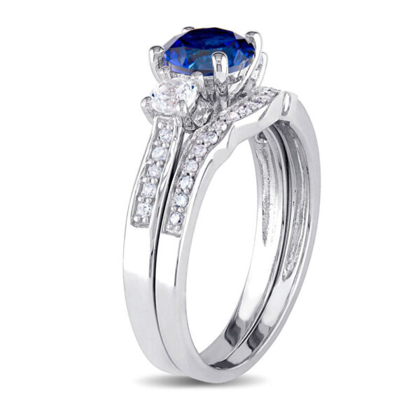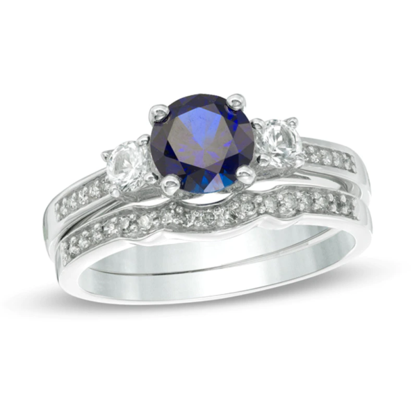 Simply stunning, this glistening bridal set is a beautiful beginning to the rest of your lives together. Shimmering in cool 10K white gold, the engagement ring features a dazzling 6.0mm bright blue sapphire flanked by a pair of smaller created white sapphires. Sparkling pav??-set diamonds adorn each side of the tapered shank for a look she can’t help but admire. On your special day, a coordinating contoured diamond-lined wedding band completes this significant expression of your love. Radiant with 1/8 ct. t.w. of diamonds and a brilliant buffed luster, this bridal set is everything she imagined and more.