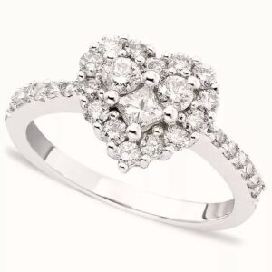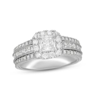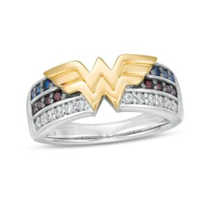 This beautiful ring for her showcases an elegant emerald-cut aquamarine at the center, surrounded by sparkling frames of round and baguette-cut white sapphires. Gorgeous pear-shaped London Blue topaz gemstones flank each side, and more round-cut white sapphires shimmer down the band to finish the look. The ring is crafted in classic sterling silver.