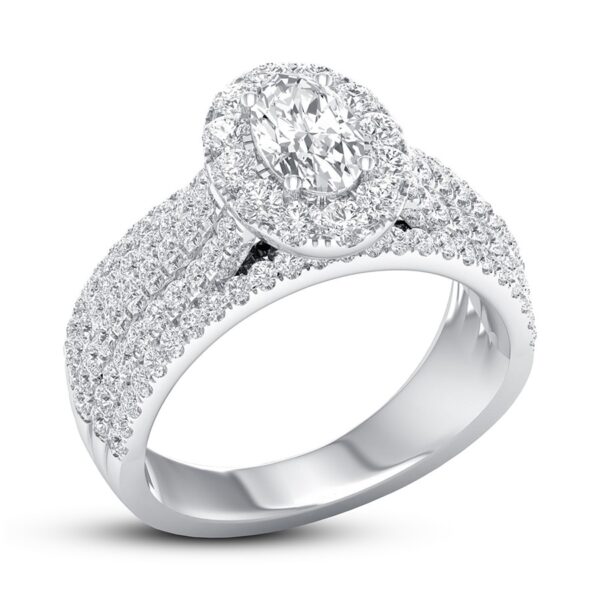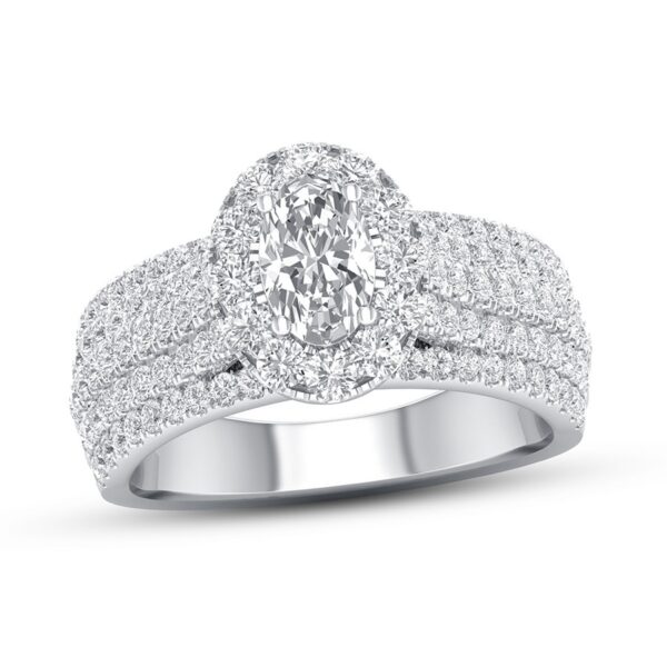 This thrilling engagement ring captures your love with independently certified diamonds. A 1/2-carat oval diamond shines at the center, while brilliant round diamonds create a halo and enhance the generous 14K white gold band. The ring has a total diamond weight of 1-3/8 carats, and the center stone is laser-inscribed with a unique serial number.