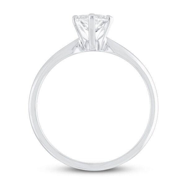 This stunning solitaire engagement ring is a beautiful way to start the rest of your lives together. The ring has a striking and classic pear-shaped diamond that sits beautifully on the gorgeous 14K white gold band. The ring has a total diamond weight of 1 carat.