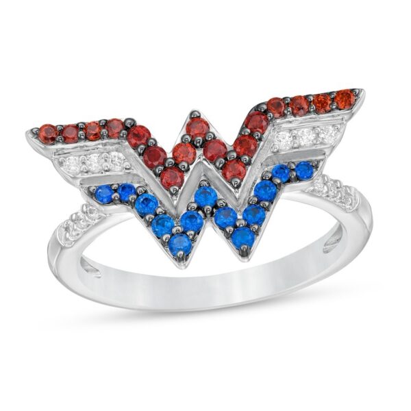 Crafted in sterling silver, this ring features majestic red garnets, brilliant sapphires and sparkling diamonds. Diamonds adorn the setting for an added touch of shimmer. This design captivates with 1/15 carat diamonds and brilliant polished brilliance, making a bold statement. This ring is only available in size 7. Sterling silver rings cannot be resized after purchase.